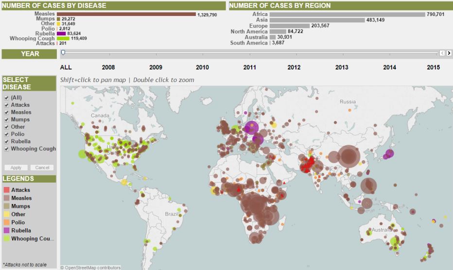 With the public’s attention on the recent measles outbreak, here is a compelling visualization authored using Tableau by the Council on Foreign Relations (CFR) — “Vaccine Preventable Outbreaks.” CFR maps vaccine preventable outbreaks since 2008. Click HERE to use the viz interactively. You can drill into the data by filtering by both year and disease, or hover over a specific outbreak for more information.