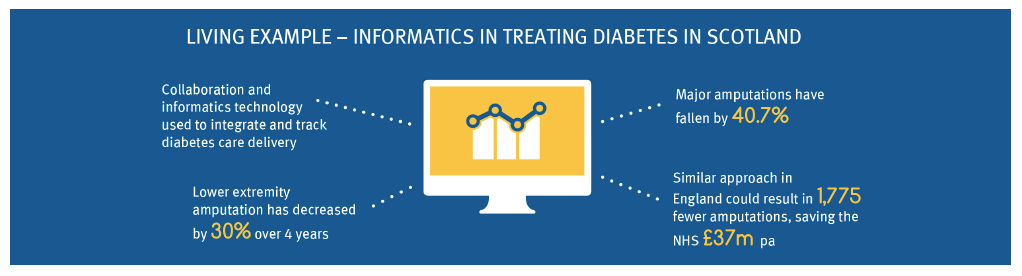 Scotland has used informatics technology to provide an integrated care model for the treatment of diabetes. GPs, patients and secondary care professionals have collaborated to treat diabetes over a period of 20 years. The informatics technology is used to track patients’ treatment and treatment outcomes that are carefully monitored and managed so as to reduce the severity of the condition. This has achieved impressive results as shown in the figure provided below.