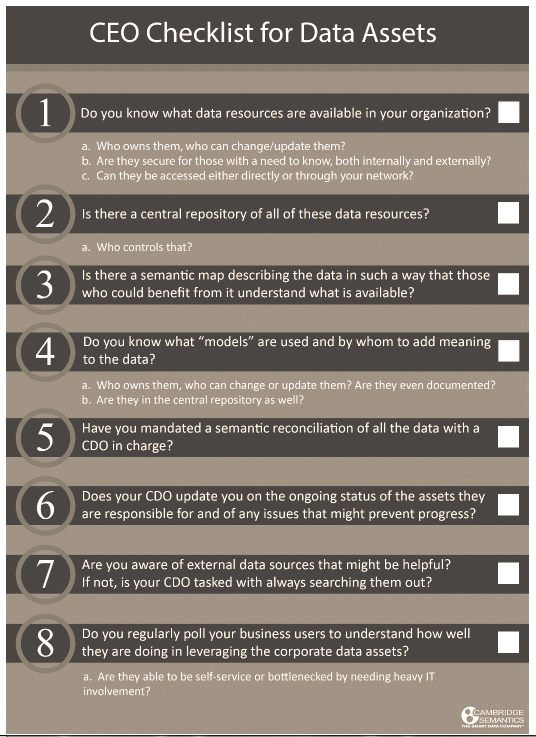 The investment in obtaining, storing, utilizing and monetizing data can involve a significant capital investment and operational expense, and the cooperation of most functional units within the enterprise. For that reason alone, the CEO has to understand the opportunities and associated costs and help to set the proper priorities concerning these efforts. At a certain level this can be delegated to business unit holders, but since enterprise data assets span across business units, it can only come together at the highest levels of the enterprise. It is not just about funding. It’s also critical that all business stakeholders across all organizational units understand the need to participate in the enterprise semantic framework to break down the otherwise inevitable silos.