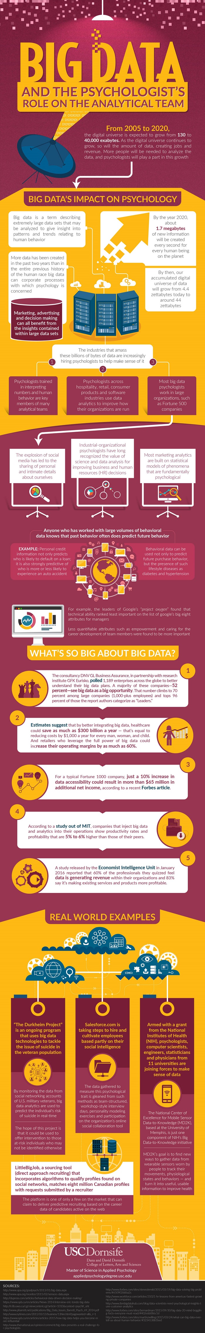 In the last two years, more data has been created than in the rest of human history combined. Thanks to advanced computing power, all this data can be used to help companies serve their customers better and become more efficient. Today, just about every large company in the United States has a data scientist on staff to make sense of the massive amounts of data they collect on an everyday basis. These data sets can hold valuable insights, but it requires technical expertise to extract these insights so they can be used to make business decisions. Now that the role of the data scientist has become essential in the workplace, more roles in data analytics are opening up in large companies—including jobs for psychologists. The infographic below from our friends over at the University of Southern California Dornsife shows us why psychologists can have such a powerful role in leveraging big data effectively.