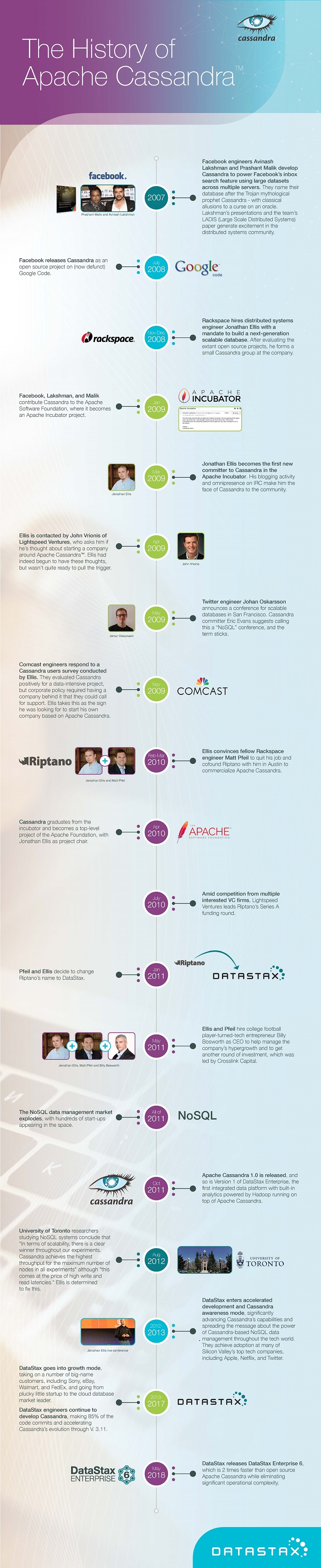 As Apache Cassandra (C*) celebrates its 10th anniversary, we wanted to observe this special time with the infographic below provided by our friends over at DataStax, industry experts on the open source project. You’ll see many insights on how C* has grown over the last ten years, including the history of the open source project from its origin after being open sourced by Facebook – to the creation of Cassandra as an Apache Software Foundation project and the exciting growth of the community – and DataStax’s significant contribution to this growth.