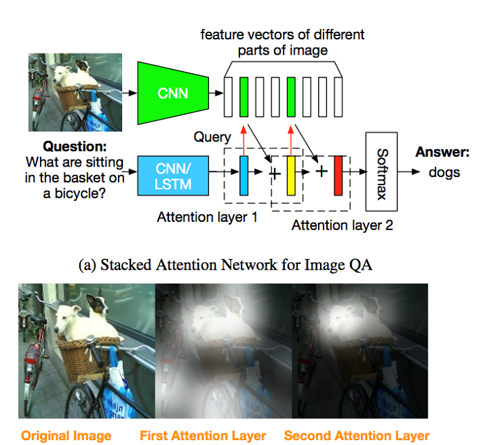 Like conventional question-answering linguistic systems, an image-based question-answering system takes a natural language input, but instead of accessing the knowledge base, it uses the attention mechanism to find the answer on the image.