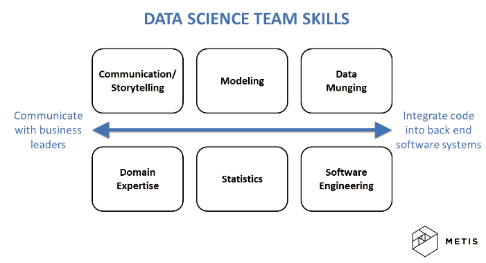 In coming up with a roadmap to use data science effectively at your company, you need to first examine your specific needs. The fact is that many businesses, especially small- and medium-sized businesses, don’t actually require cutting-edge data science techniques to get a leg up on the competition. Still, there are some skills that every data science function at every company needs. You can think about data science team skills as on a continuum spread from the business side to the engineering side, as seen in the image below: