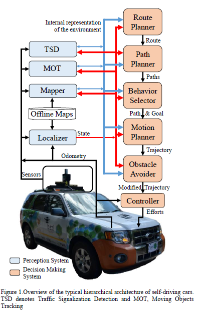 This paper surveys research on self-driving cars published in the literature focusing on autonomous cars developed since the DARPA challenges, which are equipped with an autonomy system that can be categorized as SAE level 3 or higher. The architecture of the autonomy system of self-driving cars is typically organized into the perception system and the decision-making system. The perception system is generally divided into many subsystems responsible for tasks such as self-driving-car localization, static obstacles mapping, moving obstacles detection and tracking, road mapping, traffic signalization detection and recognition, among others. The decision-making system is commonly partitioned as well into many subsystems responsible for tasks such as route planning, path planning, behavior selection, motion planning, and control. The survey presents the typical architecture of the autonomy system of self-driving cars, and also reviews research on relevant methods for perception and decision making.