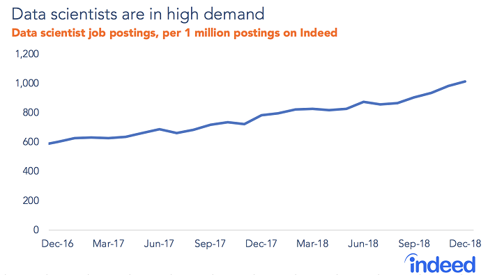 Job postings for data scientists as a share of all postings were up 29% in December 2018 compared to a year before. This is just another solid year in what has been a spectacular and steady rise in the number of data science jobs on Indeed.com, the world’s largest job site. Since December 2013, postings are up 344% — more than quadrupling over five years. Employers use data scientists to solve all sorts of problems. In essence, data scientists are tasked to “transform raw data into meaningful information using data-oriented programming languages and visualization software,” according to the Bureau of Labor Statistics (BLS).