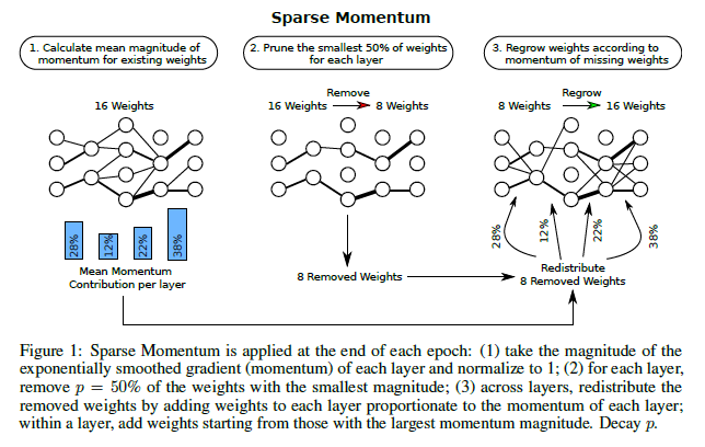 This paper demonstrates the possibility of what is called sparse learning: accelerated training of deep neural networks that maintain sparse weights throughout training while achieving dense performance levels. This paper accomplishs this by developing sparse momentum, an algorithm which uses exponentially smoothed gradients (momentum) to identify layers and weights which reduce the error efficiently. Sparse momentum redistributes pruned weights across layers according to the mean momentum magnitude of each layer. Within a layer, sparse momentum grows weights according to the momentum magnitude of zero-valued weights. The paper demonstrates state-of-the-art sparse performance on MNIST, CIFAR-10, and ImageNet, decreasing the mean error by a relative 8%, 15%, and 6% compared to other sparse algorithms. The PyTorch code for this paper can be found HERE.