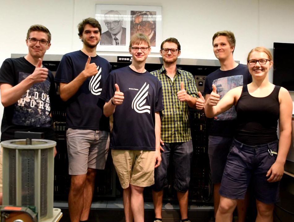 The students of Friedrich-Alexander-Universität Erlangen-Nürnberg comprising team deFAUlt in the Student Cluster Competition of SC19. Left to right: David Sauerwein, Florian Klöppner, Sebastian Bönning, Dirk Plachta, Johannes Lebender and Eva Dengler. © FAU