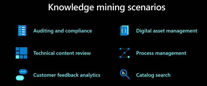 The process of extracting meaningful information after analyzing all data and documents owned by an organization is known as knowledge mining. Azure Cognitive Search helps organizations discover patterns and relationships in all existing content, understand the sentiment, extract key phrases and more.