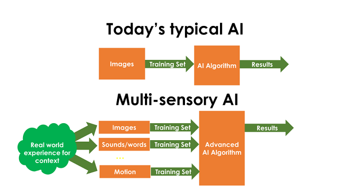 Consider that any child can learn a language from scratch. They can understand the passage of time and know the basic physics that round things roll and square things don’t. Kids recognize that all objects fall down not up, and understand cause-and-effect. How? Quite simply, children learn through multiple senses and through interaction with objects. In this way, a child has the advantage over AI in that he or she learns everything in the context of everything else. A child knows from playing with blocks that a stack must be built before it can fall down, and that blocks will never spontaneously stack themselves. This is in contrast to a dog, which might spontaneously do many things.