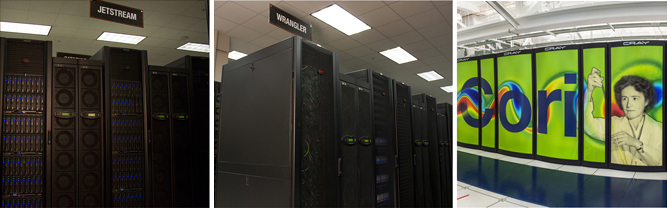The Cornell research team employed the supercomputers Jetstream, Wrangler, and Cori (left to right). (Credit: TACC/NERSC)