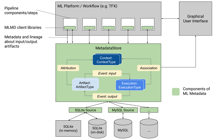 ML Metadata is “a library for recording and retrieving metadata associated with ML” and part of TensorFlow Extended (TFX), the ecosystem around the popular Machine Learning framework TensorFlow.