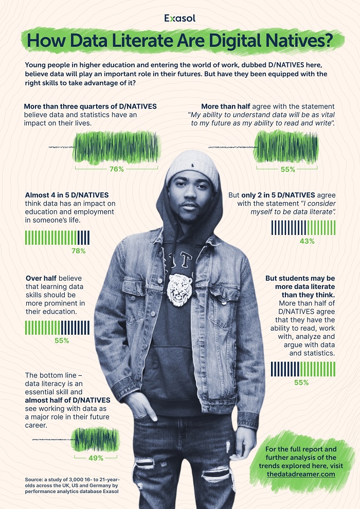 Exasol’s report: “D/NATIVES: The future of your business” aims to help educators and business leaders understand how they can bridge the data literacy gap and unlock the potential of today’s D/NATIVES as they enter an increasingly data-led economy. The report can be downloaded here, on Exasol’s Data Dreamer platform. #ImADataDreamer is designed by modern data professionals, for the modern data professional – uncovering stories of the real people behind data. It’s packed with regular new content and insights from credible voices within the industry – from data visualization experts to data scientists and Chief Data Officers – as they tell stories about how data is changing lives while also sharing their own experiences of working with data.