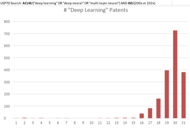 Deep Learning Patent Update – provided by Nelson E. (Nick) Brestoff, J.D., M.S. Exec. Manager & Chief Inventor, Intraspexion LLC. After 16 weeks in 2021, the number of “deep learning” patents is 381. At the current pace per week, the count is only one week away from the number of patents in the entire year of 2019 (396). At this rate, the projected total for 2021 is 1,257 patents, which is strong growth from 2020, when the total was 726.