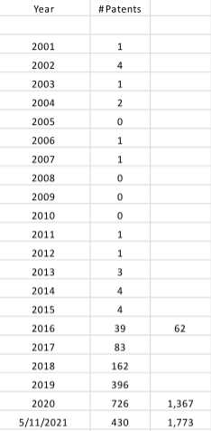 Deep Learning Patent Update – provided by Nelson E. (Nick) Brestoff, J.D., M.S. Exec. Manager & Chief Inventor, Intraspexion LLC. This week, the patent numbers had hit the 11 million mark, and the first new “deep learning” patent was 11,002,202 to Cummins Inc. For this week, there were 24 new patents, for a total of 430 in 2021. Cisco Technology, Inc., General Electric and IBM had two new patents each. Since January 1, 2017, there have been 1,797 new “deep learning” patents, an average of about 413 per year. In all of the years since January 1, 2001, the average was only 4 per year. The Land Rush since January 1, 2017 continues to be spectacular.