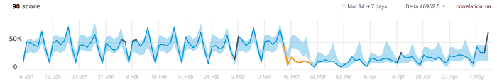 New technologies allow organizations to automate business monitoring and anomaly detection. Below is an example of an AI-driven alert triggered after the system detected an anomalous drop in an organization’s revenue. Their metric shifted to the KPI’s new pattern soon after the onset of COVID-19 in the United States.