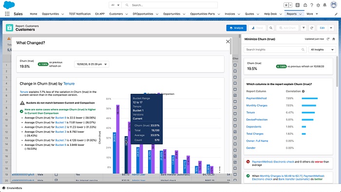 - Einstein Discovery for Salesforce Reports auto analyzes data from Salesforce reports quickly and thoroughly to explore and identify the most important insights, surfacing them with charts and explanations that are easy to understand. It helps reduce the barrier to machine learning by enabling direct access to the associated Einstein Discovery story, where users can analyze further.
