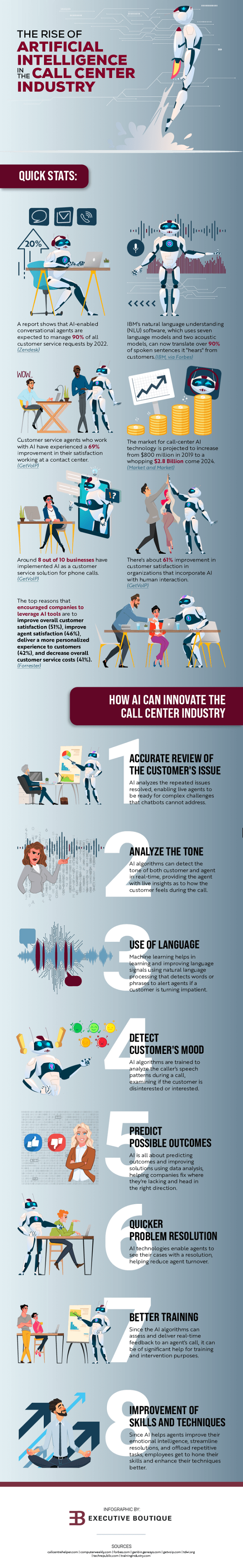 Artificial intelligence will soon break into the call center industry even more to complement the work of human agents, and its wide potential applications are promising. The infographic below courtesy of our friends over at Executive Boutique will show you some statistics about artificial intelligence and how call centers can integrate AI into their existing business processes.