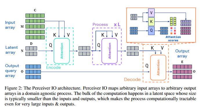 The recently-proposed Perceiver model obtains good results on several domains (images, audio, multimodal, point clouds) while scaling linearly in compute and memory with the input size. While the Perceiver supports many kinds of inputs, it can only produce very simple outputs such as class scores. Perceiver IO overcomes this limitation without sacrificing the original’s appealing properties by learning to flexibly query the model’s latent space to produce outputs of arbitrary size and semantics. Perceiver IO still decouples model depth from data size and still scales linearly with data size, but now with respect to both input and output sizes. The full Perceiver IO model achieves strong results on tasks with highly structured output spaces, such as natural language and visual understanding, StarCraft II, and multi-task and multi-modal domains. As highlights, Perceiver IO matches a Transformer-based BERT baseline on the GLUE language benchmark without the need for input tokenization and achieves state-of-the-art performance on Sintel optical flow estimation. The GitHub repo associated with this paper can be found HERE.