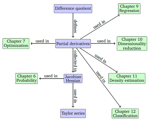 The book includes very clear and concise mathematics with no “hand waving” in the derivations but instead every chapter has many long worked-out “Examples” that drill-down into the theory. Again, the authors include beautiful visualizations designed to aid in the understanding of the math as depicted in the adjacent figure. Further, each chapter includes well-crafted exercises to help the reader hone their understanding of the topics. Some of my favorite treatments in the book include: singular value decomposition (Section 4.5), Gradients of Vector-valued Functions (Section 5.3), Optimization Using Gradient Descent (Section 7.1), Bayesian Linear Regression (Section 9.3), and Dimensionality Reduction with PCA (Chapter 10).