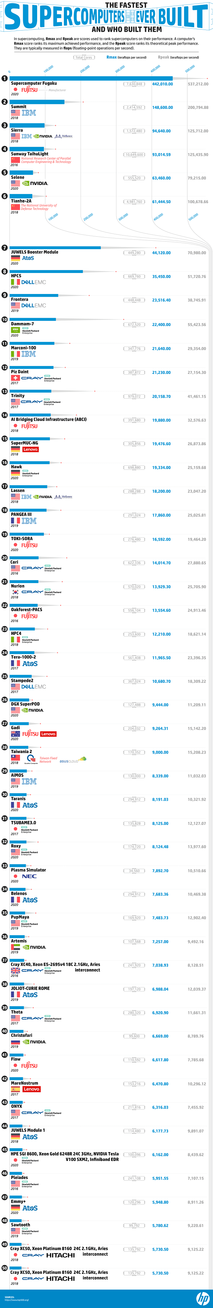 The HP research team consulted data from supercomputer ranking project TOP500 to visualize the most powerful supercomputers in the world as well as their country and company of development.