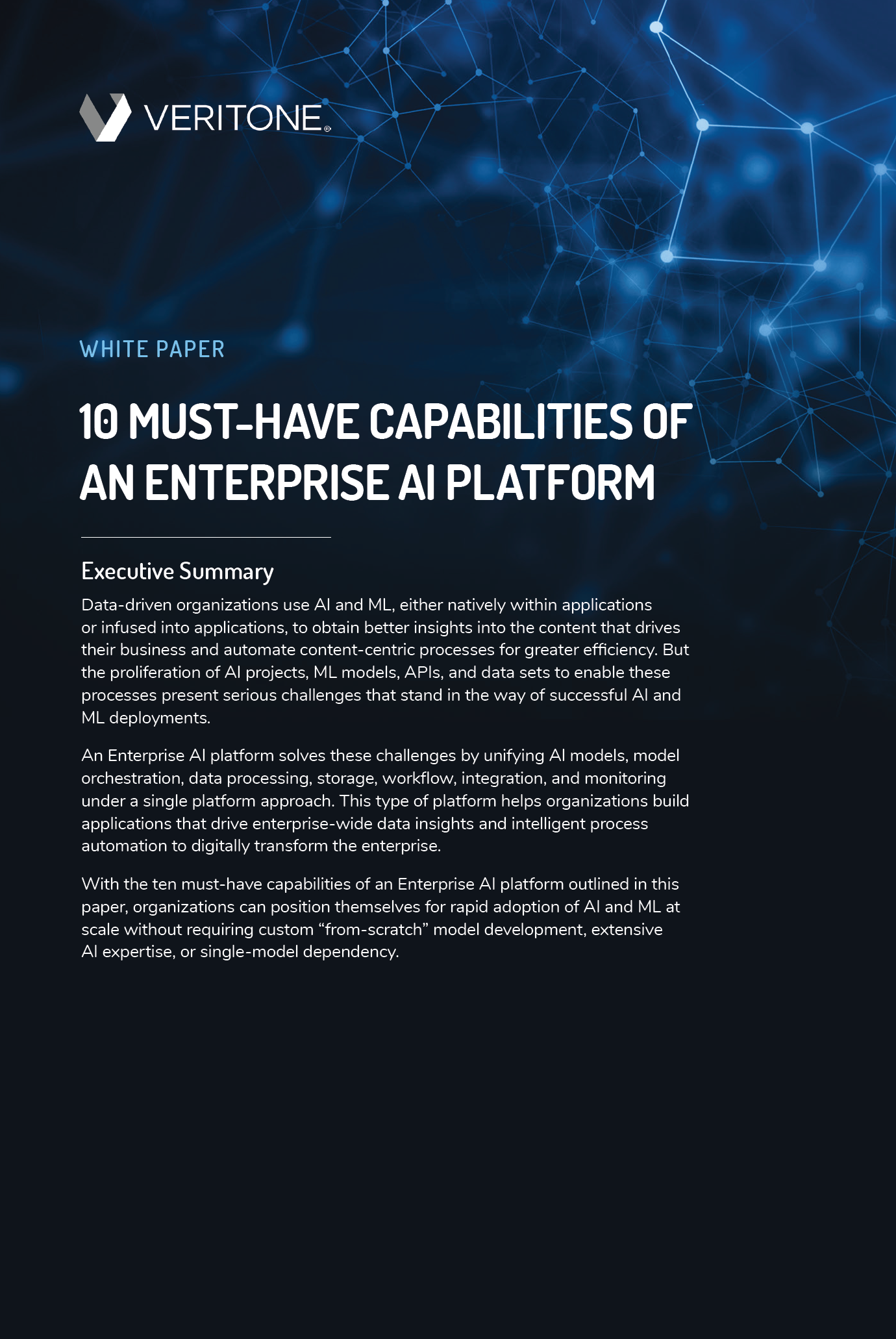 With the ten must-have capabilities of an Enterprise AI platform outlined in this white paper, “10 Must-Have Capabilities of an Enterprise AI Platform,” from Veritone, organizations can position themselves for rapid adoption of AI and ML at scale without requiring custom “from-scratch” model development, extensive AI expertise, or single-model dependency.