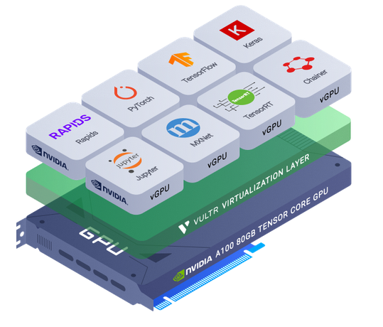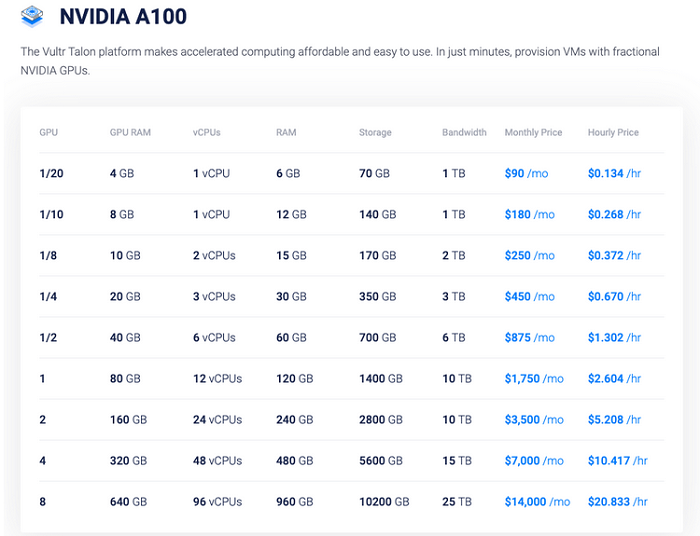 Vultr is the first cloud provider to offer virtualization of NVIDIA A100 Tensor Core GPUs to enable GPU sharing. With the launch today, Vultr is introducing a set of virtual machine (VM) plans featuring the NVIDIA A100, starting at just $90 per month, or $0.13 per hour.