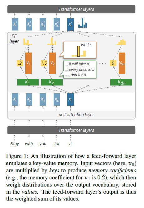 Abstract: Feed-forward layers constitute two-thirds of a transformer model’s parameters, yet their role in the network remains under-explored. We show that feed-forward layers in transformer-based language models operate as key-value memories, where each key correlates with textual patterns in the training examples, and each value induces a distribution over the output vocabulary. Our experiments show that the learned patterns are human-interpretable, and that lower layers tend to capture shallow patterns, while upper layers learn more semantic ones. The values complement the keys’ input patterns by inducing output distributions that concentrate probability mass on tokens likely to appear immediately after each pattern, particularly in the upper layers. Finally, we demonstrate that the output of a feed-forward layer is a composition of its memories, which is subsequently refined throughout the model’s layers via residual connections to produce the final output distribution.