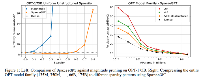 A new research paper shows that large-scale generative pretrained transformer (GPT) family models can be pruned to at least 50% sparsity in one-shot, without any retraining, at minimal loss of accuracy. This is achieved via a new pruning method called SparseGPT, specifically designed to work efficiently and accurately on massive GPT-family models. When executing SparseGPT on the largest available open-source models, OPT-175B and BLOOM-176B, we can reach 60% sparsity with negligible increase in perplexity: remarkably, more than 100 billion weights from these models can be ignored at inference time. SparseGPT generalizes to semi-structured (2:4 and 4:8) patterns, and is compatible with weight quantization approaches.