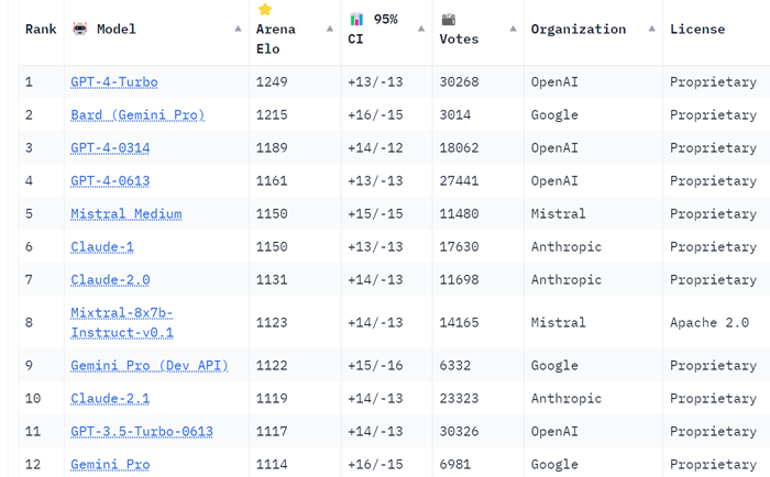 [1/29/2024] ALERT! Google Bard has moved into 2nd place on HuggingFace’s Chatbot Arena Leaderboard, moving past GPT-4 and trailing only GPT-4 Turbo in the crowdsourced LLM rankings.