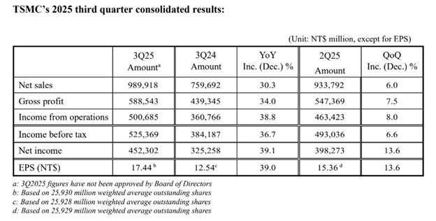 HSINCHU, Taiwan, R.O.C., Oct. 16, 2025 — TSMC (TWSE: 2330, NYSE: TSM) today announced consolidated revenue of NT$989.92 billion, net income of NT$452.30 billion, and diluted earnings per share of NT$17.44 (US$2.92 per ADR unit) for the third quarter ended September 30, 2025.