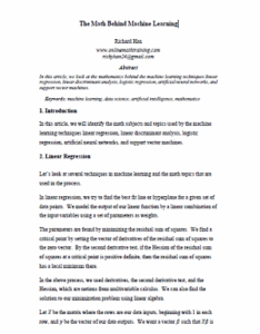 What math subjects are used in machine learning, and how are they used? In this research paper authored by Richard Han, Ph.D., we look at the mathematics behind the machine learning techniques linear regression, linear discriminant analysis, logistic regression, artificial neural networks, and support vector machines.